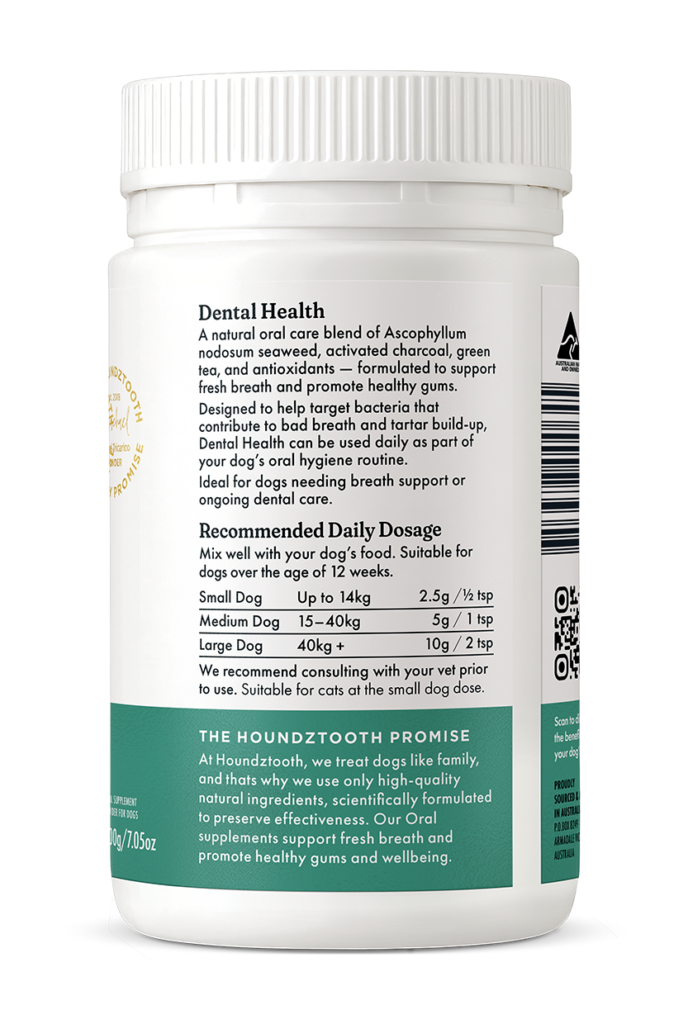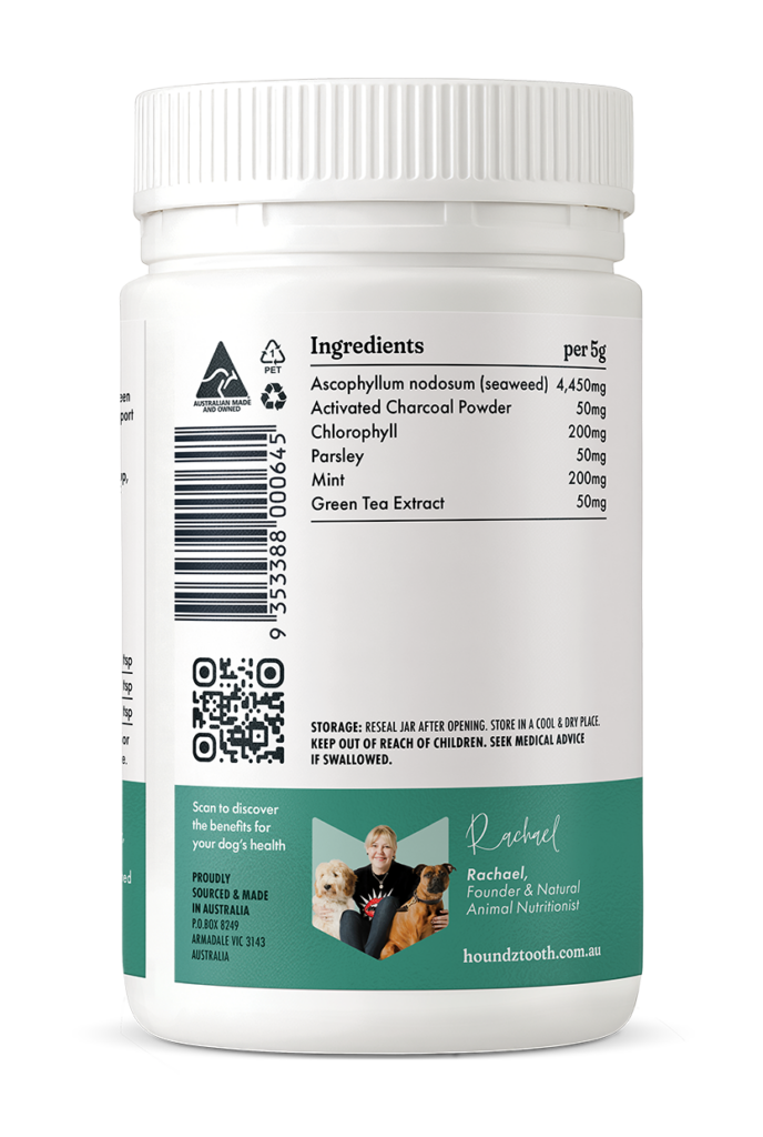 Our unique and natural blend of ascophyllum nodosum (seaweed), charcoal, chlorophyll, parsley, mint and green tea extract to help promote oral health. Professionally formulated and may help support oral hygiene, bad breath and dental maintenance. Ascophyllum nodosum is a nutritional dental supplement due to its abundance of vitamins, minerals, amino acids and antioxidants. Flavoured with natural seaweed that your dog will love.