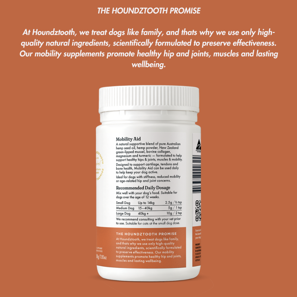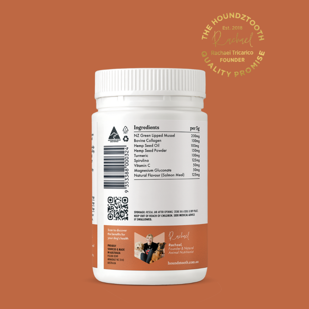Like us, dogs suffer from sore muscles and joints for different reasons. Our Hemp Mobility Aid is a unique and natural blend of pure Australian hemp seed oil, hemp powder, New Zealand green lip mussel, collagen, magnesium, and turmeric. Professionally formulated to support the maintenance of your dog’s mobility. Key ingredients include fatty acids, vitamins and minerals such as Vitamin C which has a role in in maintaining healthy cartilage, tendons and bone and Magnesium which maintains general metabolism and the formation of bone. Our Hemp Mobility Aid is boosted with collagen to support optimal vitality and wellbeing.