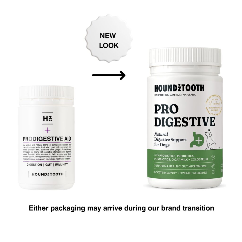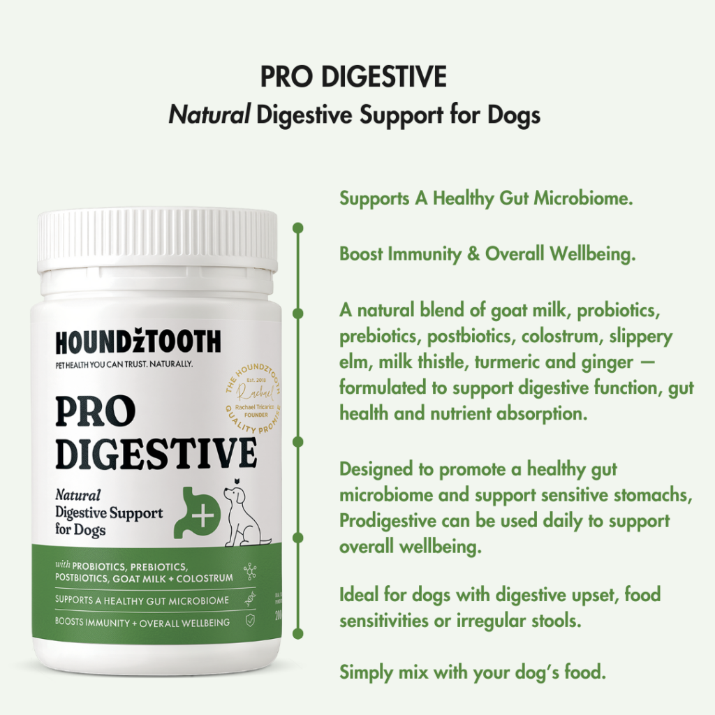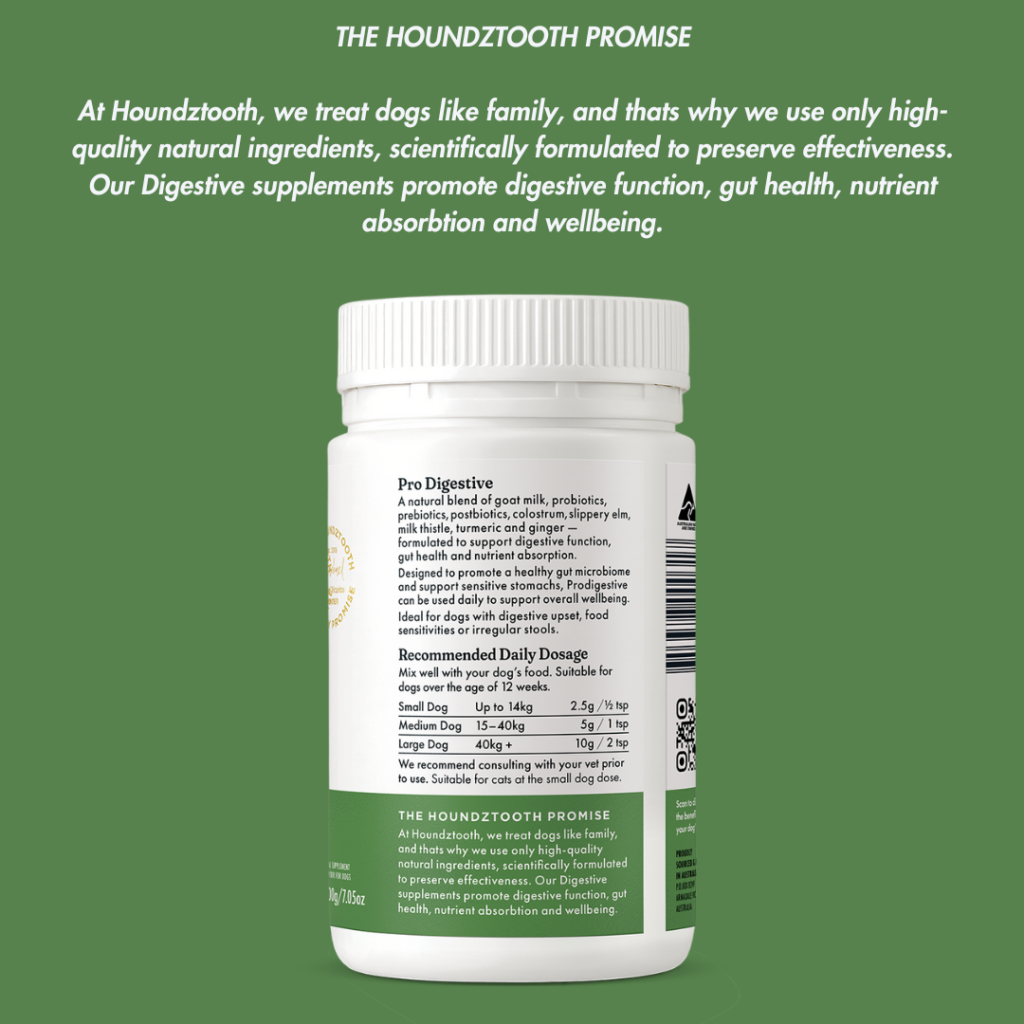 Our unique and natural blend of advanced probiotics and prebiotics mixed with Australian goat milk, colostrum, milk thistle, slippery elm, spirulina and ginger. Professionally formulated for dog’s with sensitive stomachs and digestive issues. Boosted with turmeric to help support your dog’s immune system. Prodigestive Aid is recommended for optimal intestinal balance to support your dog’s health and wellbeing.