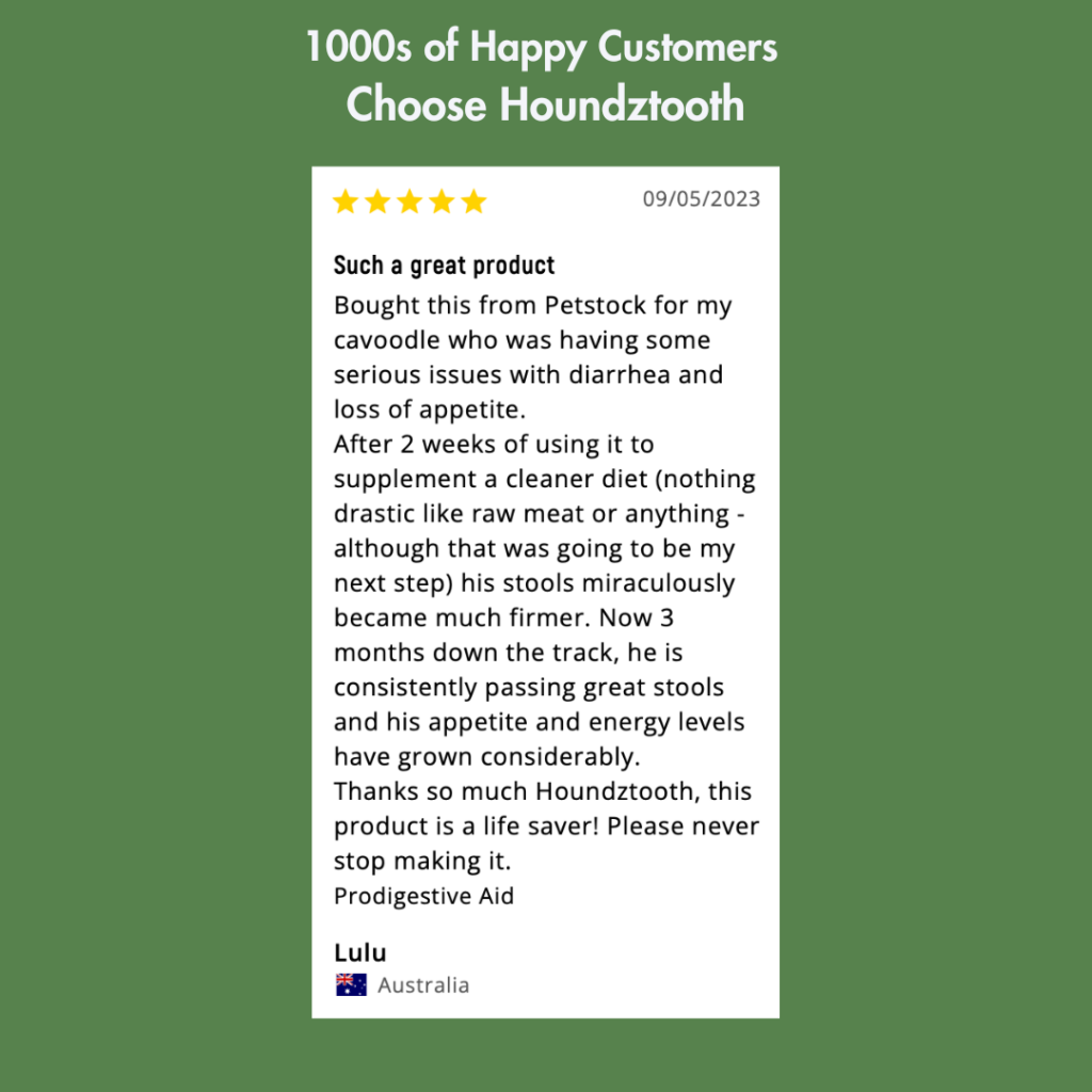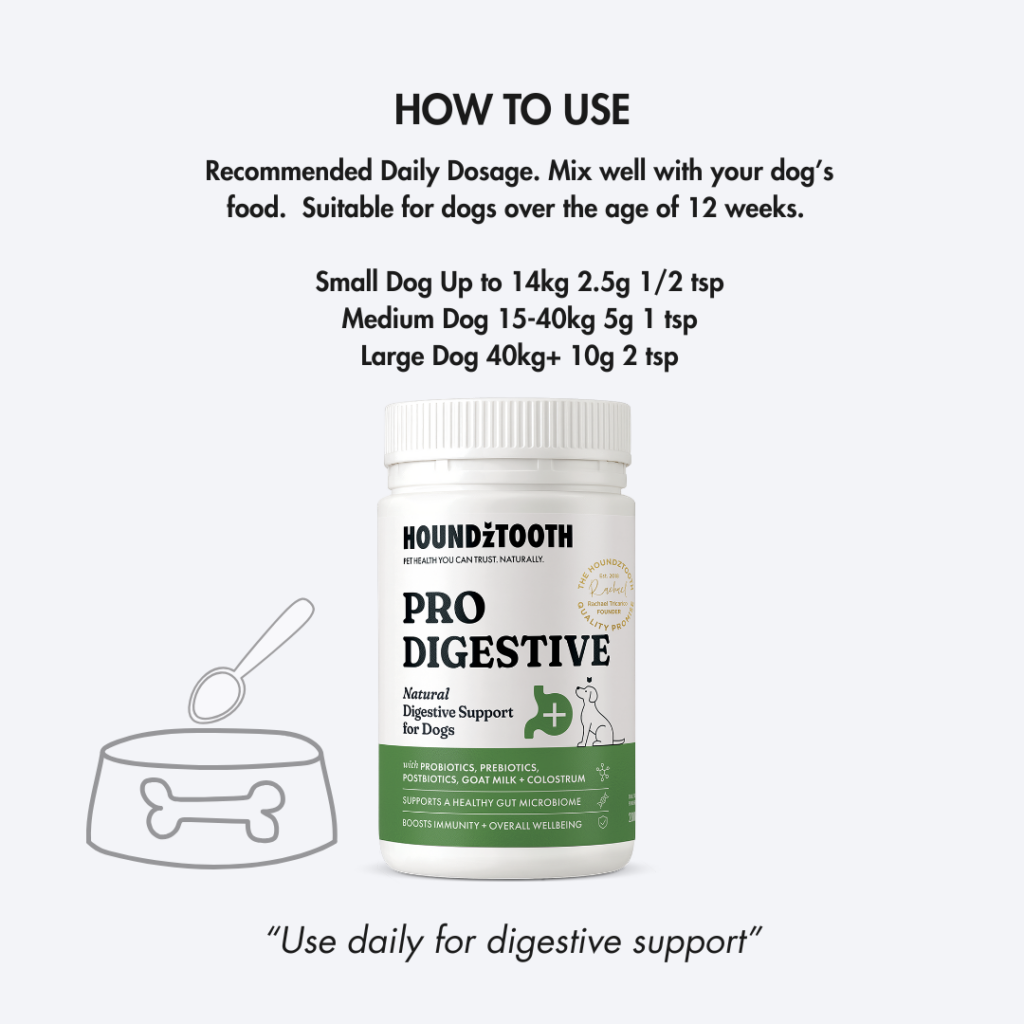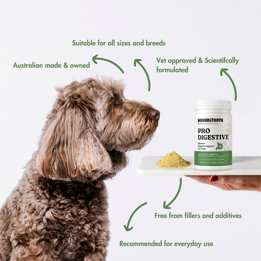 Our unique and natural blend of advanced probiotics and prebiotics mixed with Australian goat milk, colostrum, milk thistle, slippery elm, spirulina and ginger. Professionally formulated for dog’s with sensitive stomachs and digestive issues. Boosted with turmeric to help support your dog’s immune system. Prodigestive Aid is recommended for optimal intestinal balance to support your dog’s health and wellbeing.