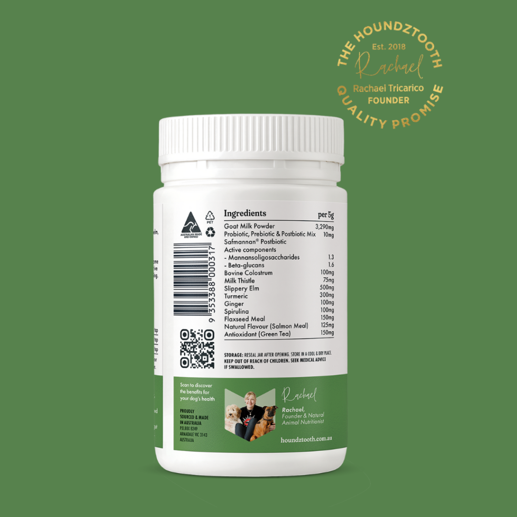 Probiotics are beneficial bacteria that live in your dog’s digestive tract. Our unique and natural blend of advanced probiotics and prebiotics mixed with Australian goat milk, colostrum, milk thistle, slippery elm, spirulina and ginger.